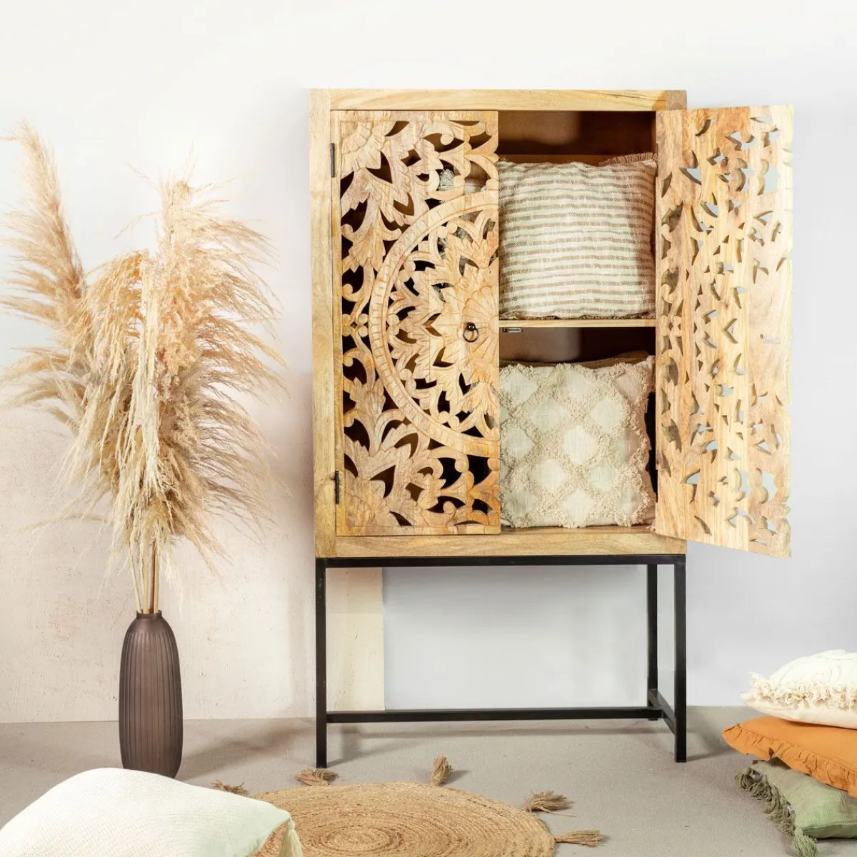 Komoda Homla Sombre To Prawdziwe Arcydzieło Sztuki Użytkowej. Na Metalowych Nogach Osadzono Pojemną Szafkę Z 2 Półkami, Która Świetnie Sprawdzi Się Do Przechowywania Różnego Rodzaju Przedmiotów. Fronty Szafki Zachwycają Wyjątkowym Designem – Ozdobiono Je Pięknym Ażurowym Wzorem, Który Przyciąga Wzrok Wysoką Estetyką I Starannym Wykonaniem. Mebel Utrzymany Jest W Kolorze Naturalnego Drewna, Dzięki Czemu Doskonale Komponuje Się Z Większością Aranżacji.Przeznaczenie
