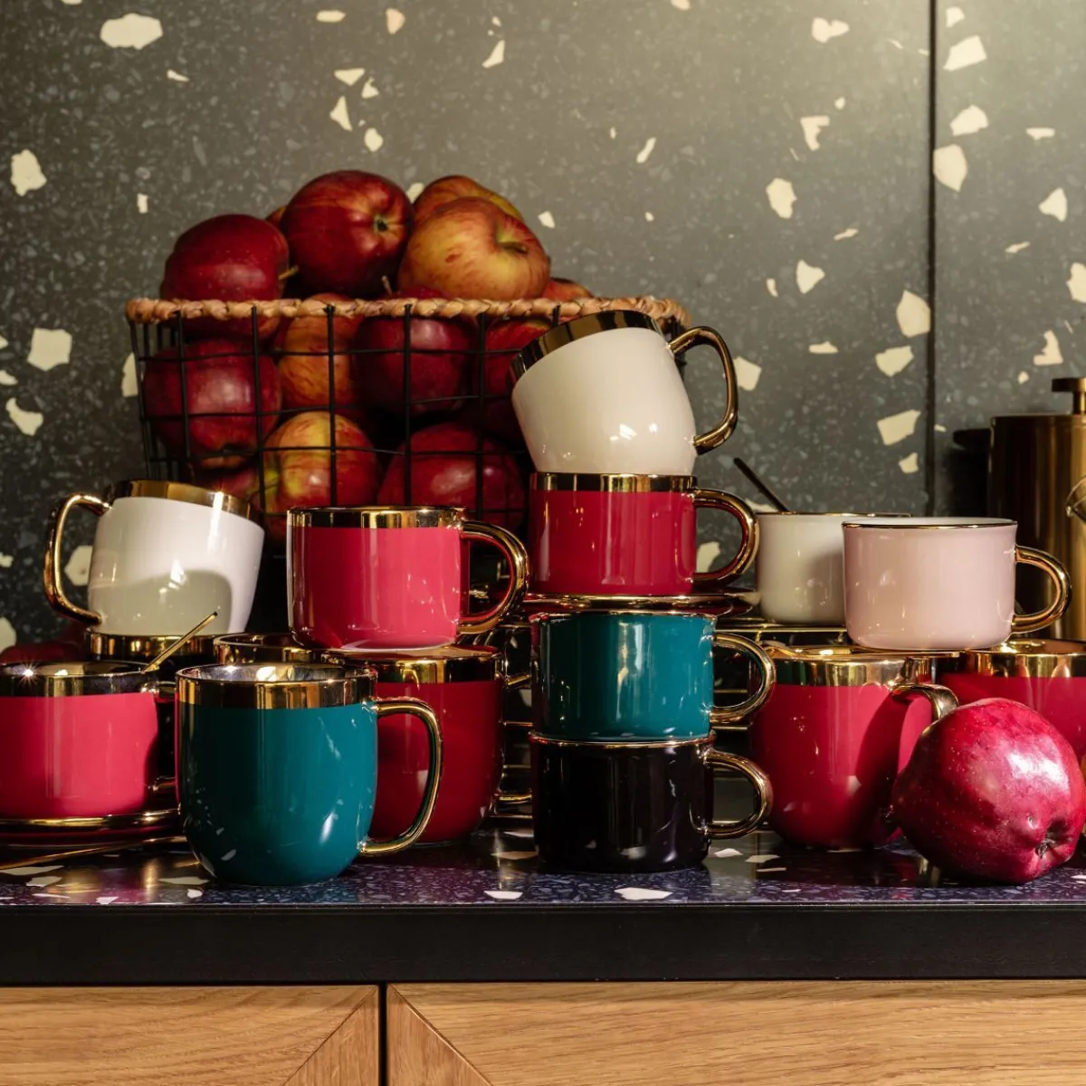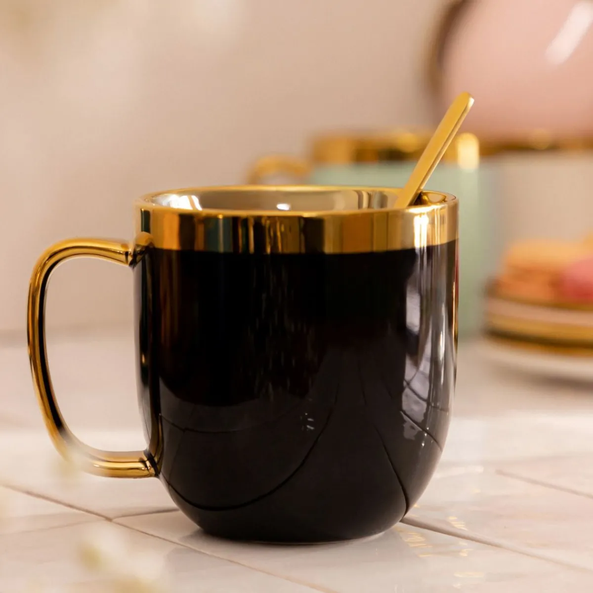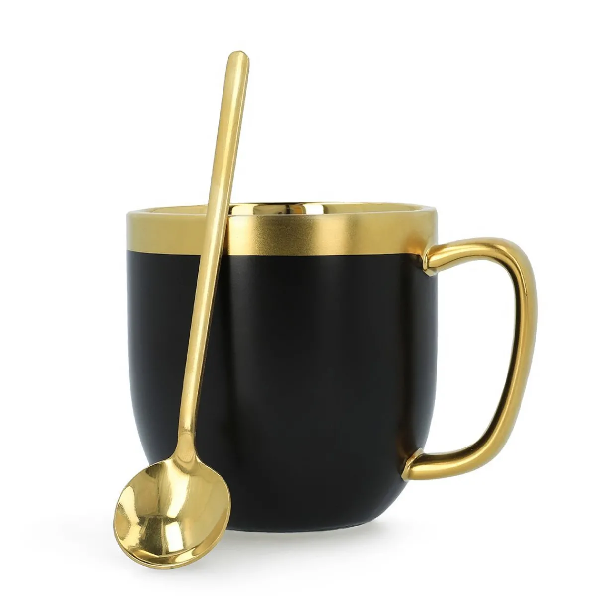 Połączenie Matowo Czarnej, Gładkiej Powierzchni Ze Złotymi Połyskującymi Elementami Tworzy Klasyczne, Ale Jednocześnie Wyszukane Zestawienie. Dodatkowo, Do Zestawu Dołączono Stylową Łyżeczkę, Która Wyróżnia Się Delikatnym, Obłym Kształtem – Dzięki Czemu Cały Zestaw Nabiera Miękkości Formy. Produkt Posiada Ergonomiczny Kształt I Wyprofilowane Ucho, Co Sprawia, Że Doskonale Leży W Dłoni.Pojemność Kubka Wynosi 280 Ml.