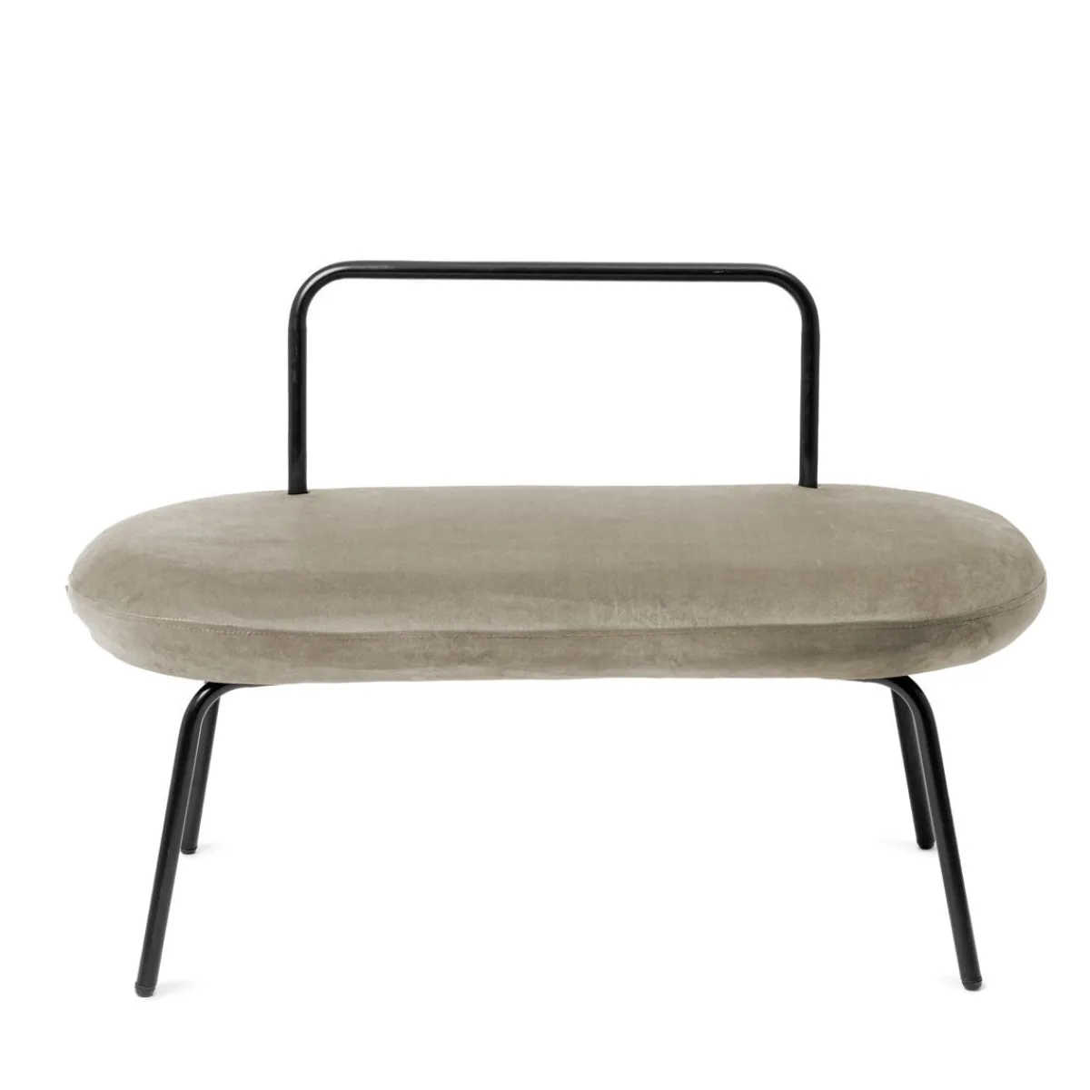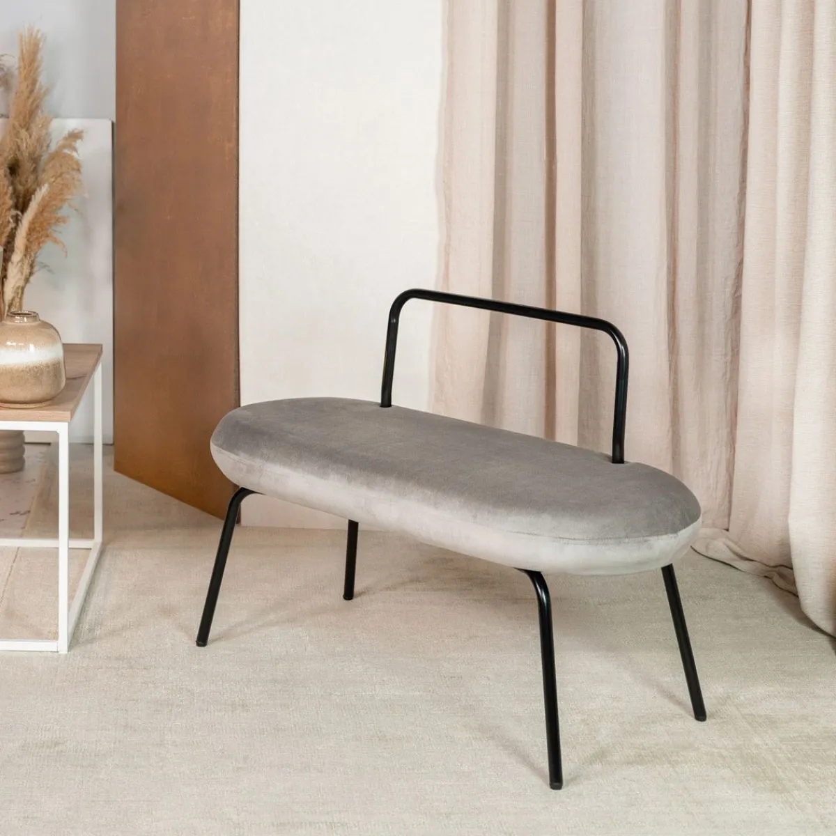 Ławka Ma Owalny Kształt. Nowoczesny Wygląd Zawdzięcza Połączeniu Tapicerki Z Miękkiego, Mieniącego Się Weluru Oraz Elementów Metalowych W Kolorze Czarnym. Wygodna, Stabilna, Łatwo Ją Przenosić I Ustawiać W Różnych Miejscach.Materiał