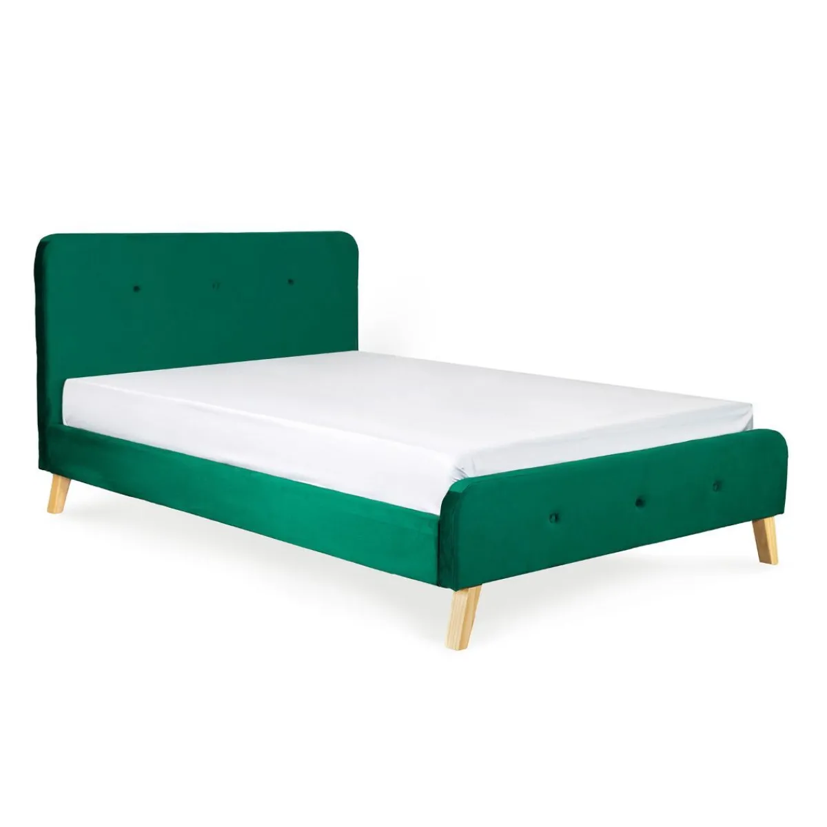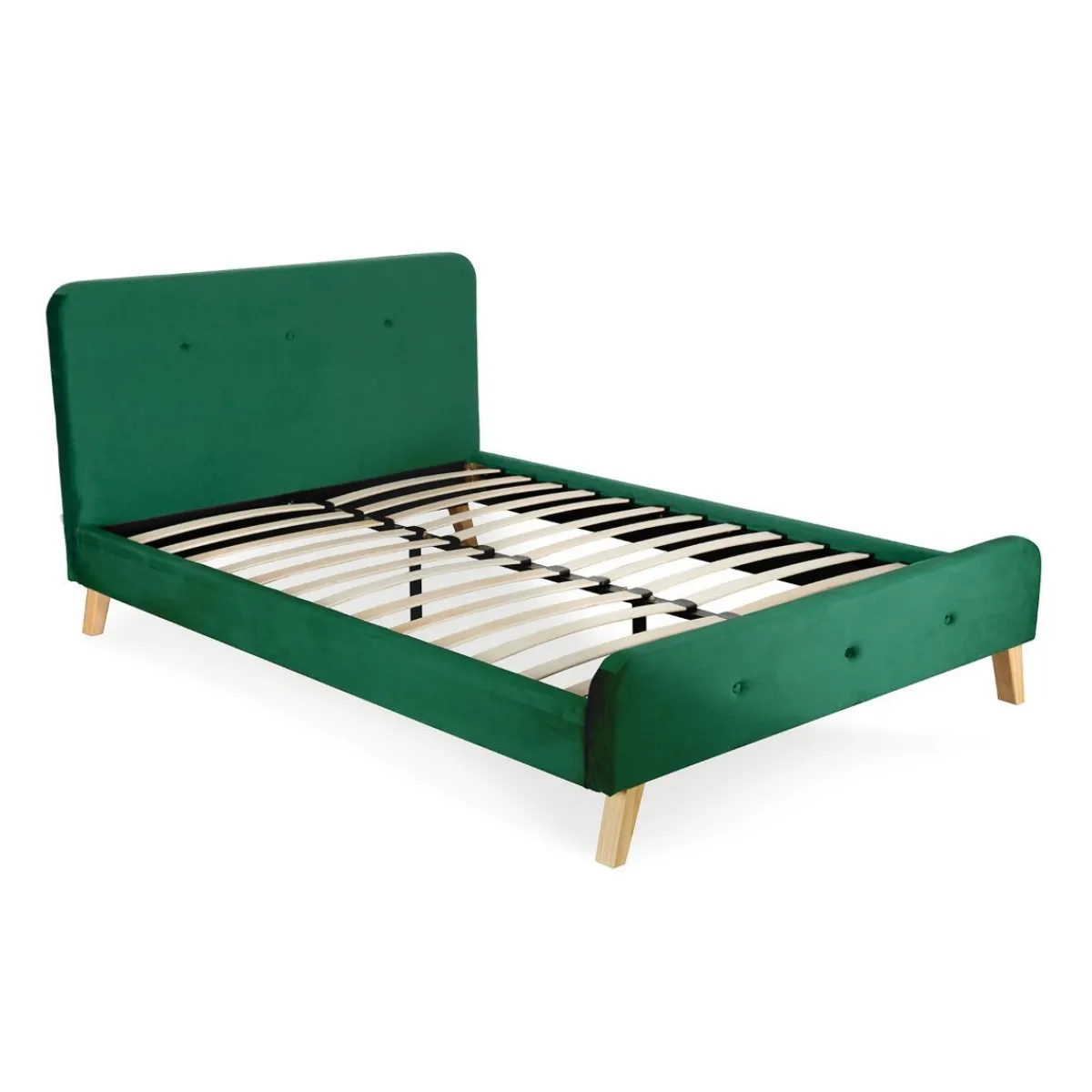 Łóżko Mikkel Obite Zostało Poliestrowym Welurem W Kolorze Butelkowej Zieleni. Jego Dno Wykonane Zostało Z Drewnianych Listewek, Co Umożliwia Swobodny Przepływ Powietrza I Wentylację Dla Materaca. Pasować Będzie Do Niego Każdy Materac O Wymiarach 160X200Cm.Produkt Do Samodzielnego MontażuW Zestawie Stelaż