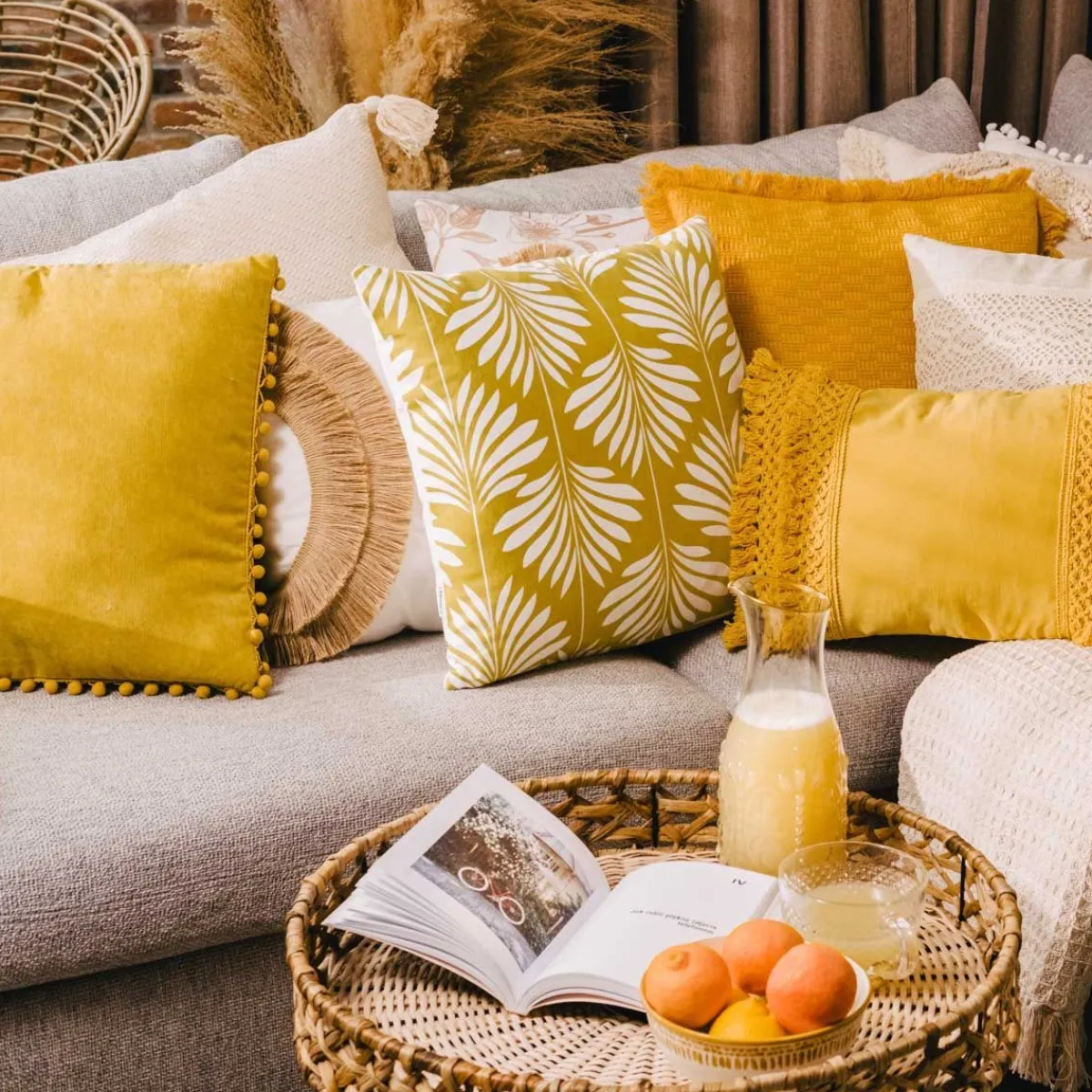 HOMLA Poszewka Eslov Musztardowa Z Pomponami 45X45 Cm