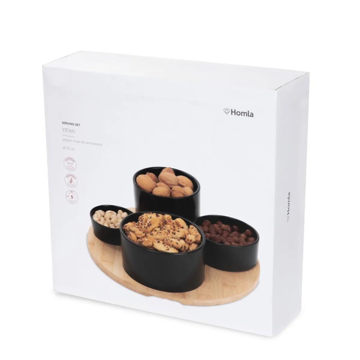 Szukasz Wyjątkowego Sposobu Na Podanie Gościom Przekąsek? Umożliwi Ci To Zestaw Misek Do Serwowania Yifan. W Skład Zestawu Wchodzą 4 Miseczki (Każda W Innym Rozmiarze) Oraz Bambusowa Deska, Która Pełni Rolę Podstawki. W Desce Umieszczono Wgłębienia, Dzięki Którym Miski Pozostają W Jednym Miejscu I Nie Przesuwają Się Nawet Podczas Przenoszenia. Czarna Kamionka Doskonale Prezentuje Się W Towarzystwie Naturalnego Drewna, Dzięki Czemu Zestaw Jest Nie Tylko Użyteczny, Ale Także Bardzo Stylowy.Przeznaczenie