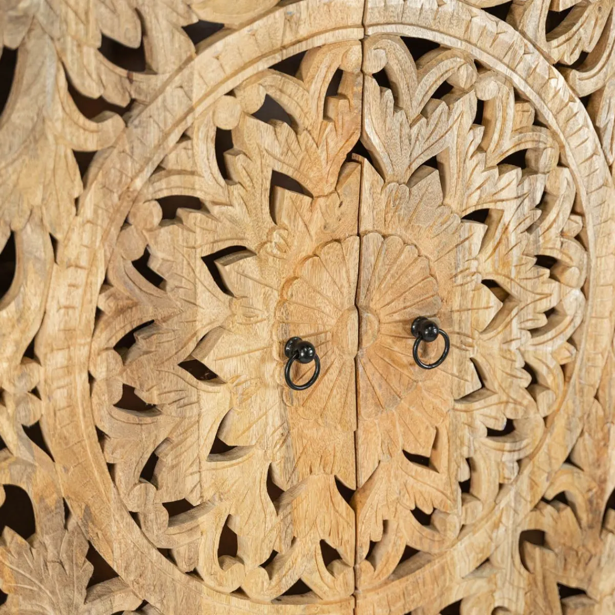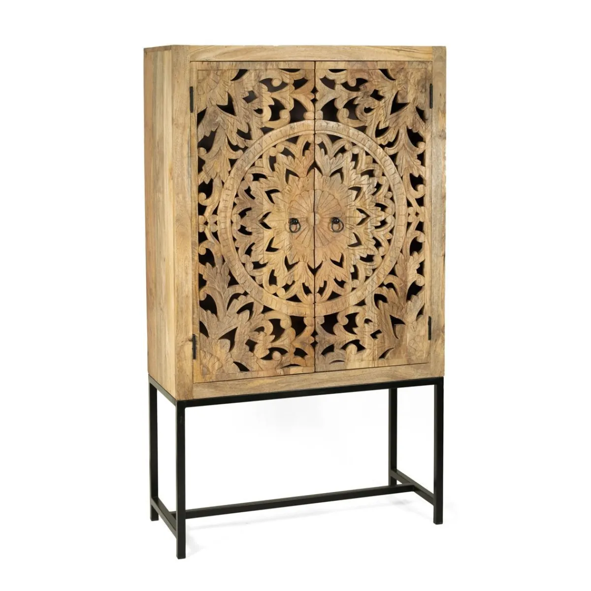 Komoda Homla Sombre To Prawdziwe Arcydzieło Sztuki Użytkowej. Na Metalowych Nogach Osadzono Pojemną Szafkę Z 2 Półkami, Która Świetnie Sprawdzi Się Do Przechowywania Różnego Rodzaju Przedmiotów. Fronty Szafki Zachwycają Wyjątkowym Designem – Ozdobiono Je Pięknym Ażurowym Wzorem, Który Przyciąga Wzrok Wysoką Estetyką I Starannym Wykonaniem. Mebel Utrzymany Jest W Kolorze Naturalnego Drewna, Dzięki Czemu Doskonale Komponuje Się Z Większością Aranżacji.Przeznaczenie