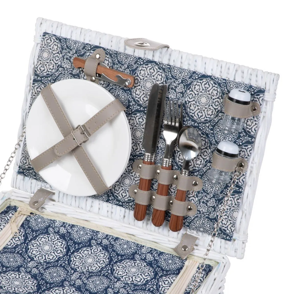 Kosz Piknikowy Orlando Jest W Pełni Wyposażony, Znajdziesz W Nim Wszystko To, Co Jest Potrzebne Do Spokojnego Pikniku Na Łonie Natury. W Skład Jego Zawartości Wchodzą M.In.: Dwa Ceramiczne Talerze, Dwa Kieliszki Z Polistyrenu Oraz Zestawy Sztućców Ze Stali Nierdzewnej. Dodatkowo Wyposażony Jest W Otwieracz Do Wina, A Także Zestaw Do Przypraw Z Solniczką I Pieprzniczką. Jest To Doskonały Towarzysz Każdej Przygody Na Świeżym Powietrzu Oraz Świetna Propozycja Na Prezent Dla Bliskiej Osoby.Materiał