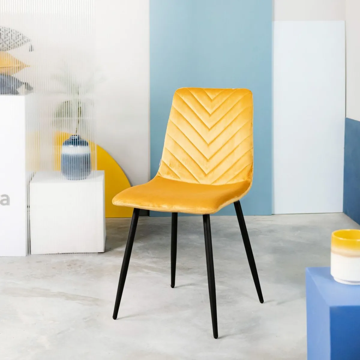 Siedzisko Oraz Oparcie Zostały Wykonane Z Płyty Mdf, Która Obita Jest Tkaniną O Welurowym Wykończeniu. Krzesło Posiada Stabilne, Metalowe Nogi. Musztardowa Tkanina Welurowa Obicia Cechuje Się Odpornością Na Uszkodzenia I Przetarcia, A Dodatkowo Jest Wyjątkowo Przyjemna W Dotyku. Materiał Najlepiej Czyścić Wilgotną Szmatką.Informacje Dodatkowe