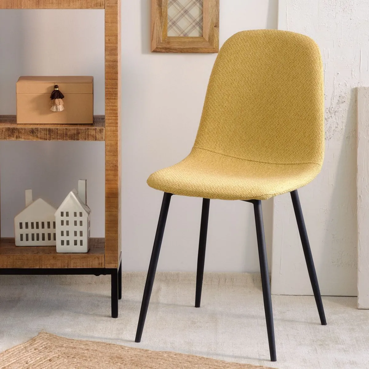 Krzesło Homla Slank Tapicerowane Tkaniną W Pięknym Musztardowym Kolorze. Stabilność Konstrukcji Zapewniają 4 Metalowe Nogi, Których Czarna Barwa Doskonale Komponuje Się Z Kolorem Siedziska, Tworząc Stylowe I Modne Połączenie. Miękkie, Przyjemne W Dotyku I Odporne Na Zniszczenia, Stworzy Wygodne Miejsce Do Siedzenia I Długo Utrzyma Atrakcyjny Wygląd.Przeznaczenie