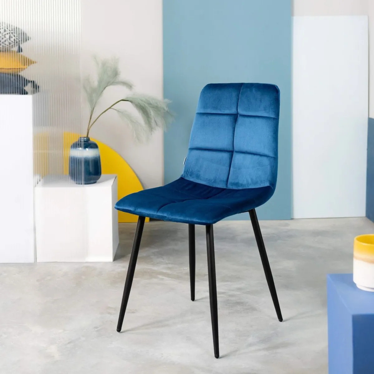Krzesło Triss Charakteryzuje Się Symetrycznym Pikowaniem W Prostokąty. Granatowa Tkanina Jest Niezwykle Elegancka I Dopełnia Czarne Nogi. Siedzisko I Oparcie W Kształcie Litery L Osadzone Jest Na Nogach O Okrągłym Przekroju Zwężających Się Ku Dołowi.Wymiary Produktu Wynoszą 44 X 57 X 88 Cm.Materiały