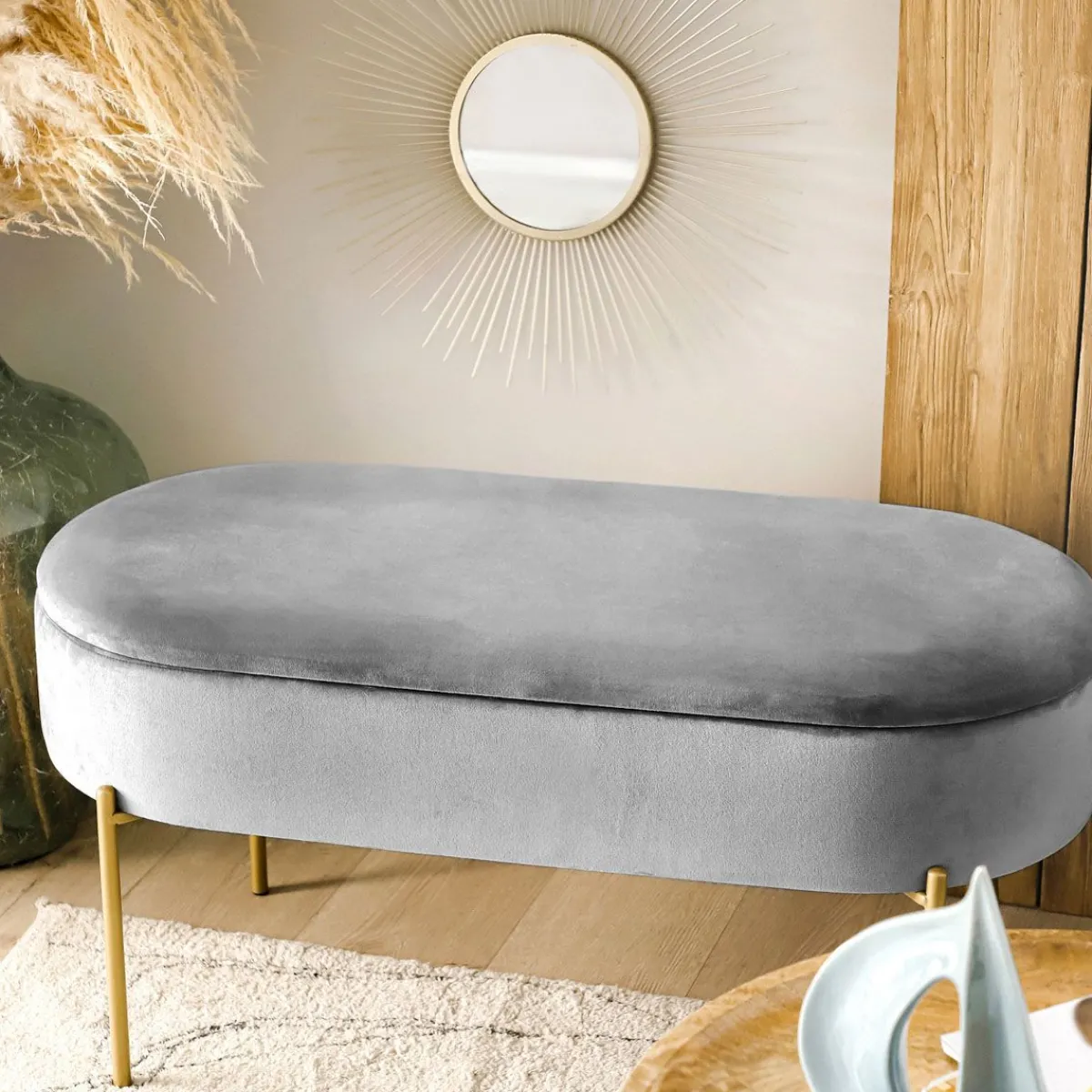 Ławka Layla Jest Bardzo Funkcjonalna, Dzięki Schowkowi Znajdującemu Się Pod Siedziskiem. Podłużna Ławka Została Utrzymana W Szarym Odcieniu. Elegancka Ławka Dopełniona Jest Nogami W Złotym Kolorze. Całość Tworzy Spójną I Ciekawą Kompozycję. Ławka Posiada Kompaktowe Wymiary.Materiał