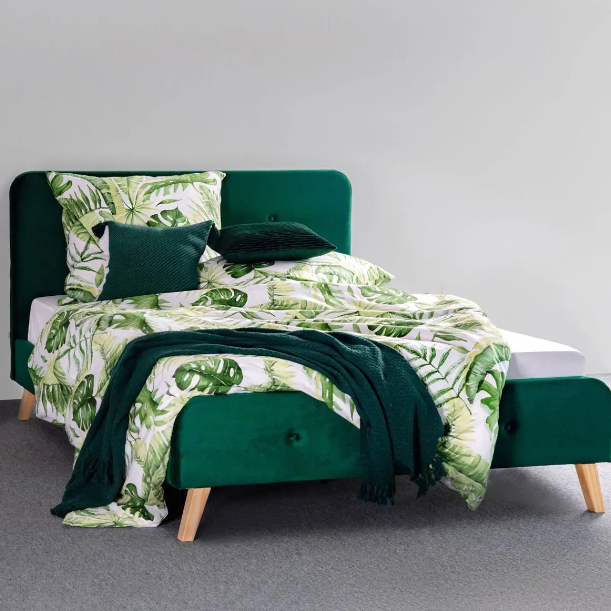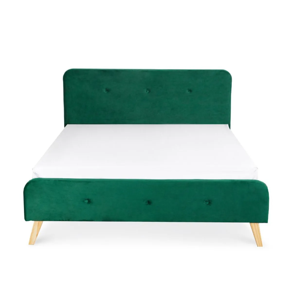 Łóżko Mikkel Obite Zostało Poliestrowym Welurem W Kolorze Butelkowej Zieleni. Jego Dno Wykonane Zostało Z Drewnianych Listewek, Co Umożliwia Swobodny Przepływ Powietrza I Wentylację Dla Materaca. Pasować Będzie Do Niego Każdy Materac O Wymiarach 160X200Cm.Produkt Do Samodzielnego MontażuW Zestawie Stelaż