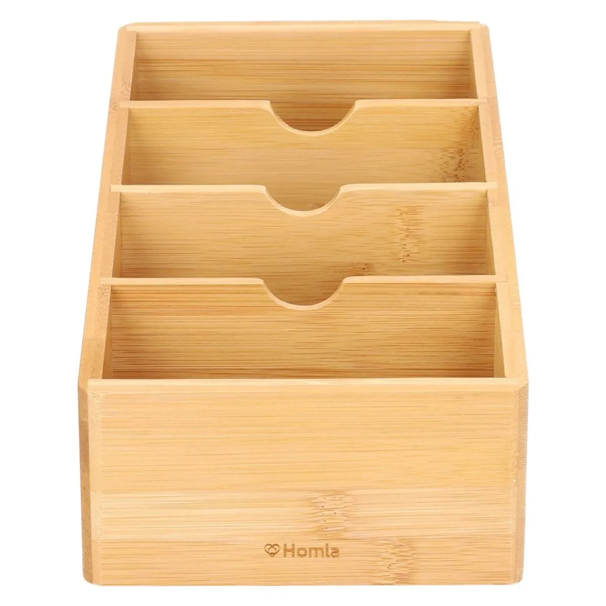 Organizer Bambou To Produkt O Wymiarach 15 X 25 X 26 Cm. Został On Wykonany W Przepięknej, Naturalnej Barwie Drewna Bambusowego, Która Nadaje Świeży Charakter Dodatkowi. Zawiera On Aż Cztery Przegródki, W Których Bez Problemu Pomieścisz Twoje Wszystkie Kuchenne Akcesoria. Na Przodzie Produktu Widnieje Również Ozdobnie Wyżłobione Logo Homla.Materiał