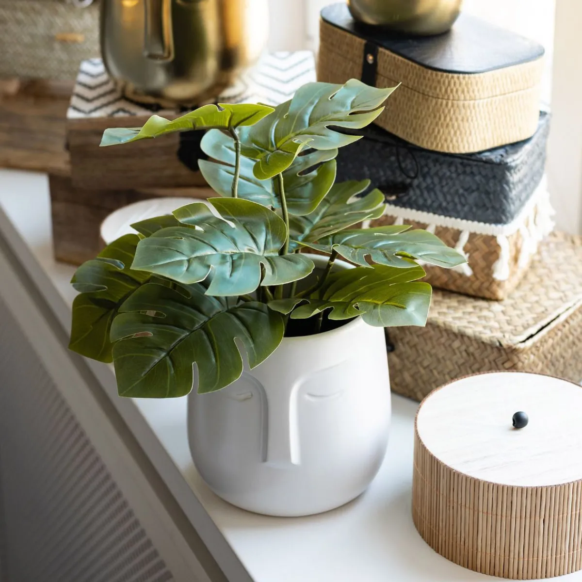 Opis ProduktuPrzeznaczenie Monstera To Swoisty Emblemat Stylu Urban Jungle. Pojawia Się Na Tapetach, Printach Poszewek, A Jej Liście W Różnej Formie Traktowane Są Jako Dekoracje. Nie Każdy Ma Jednak Rękę Do Kwiatów – I Dla Tych Bez Talentów Ogródniczych Jest Właśnie Sztuczna Roślina Monstera. Wprowadzi Ona Element Stylu Botanicznego, A Postawiona W Łazience Rozjaśni Pomieszczenie I Podkreśli Elegancki Charakter Wnętrza. Cechy Charakterystyczne Sztuczna Monstera Ma Rozłożysty Pokrój I Drobne Listki O Zbitym Jeszcze, Nie Do Końca Podziurawionym Kształcie. Do Zestawu Dołączona Jest Czarna Doniczka, Jednak Roślina Lepiej Prezentuje Się W Osłonce Pasującej Do Aranżacji. Produkt Ma Kompaktowe Wymiary (12 Cm Średnicy X 29 Cm Wysokości), Dzięki Czemu Z Powodzeniem Przeniesiesz Ją Z Pokoju Do Pokoju. Materiał Monstera Wykonana Jest W Całości Z Tworzywa Sztucznego. W Odróżnieniu Od Żywego Odpowiednika, Jest Banalnie Prosta W Pielęgnacji – Wystarczy Przecierać Ją Z Kurzu Wilgotną Szmatką.