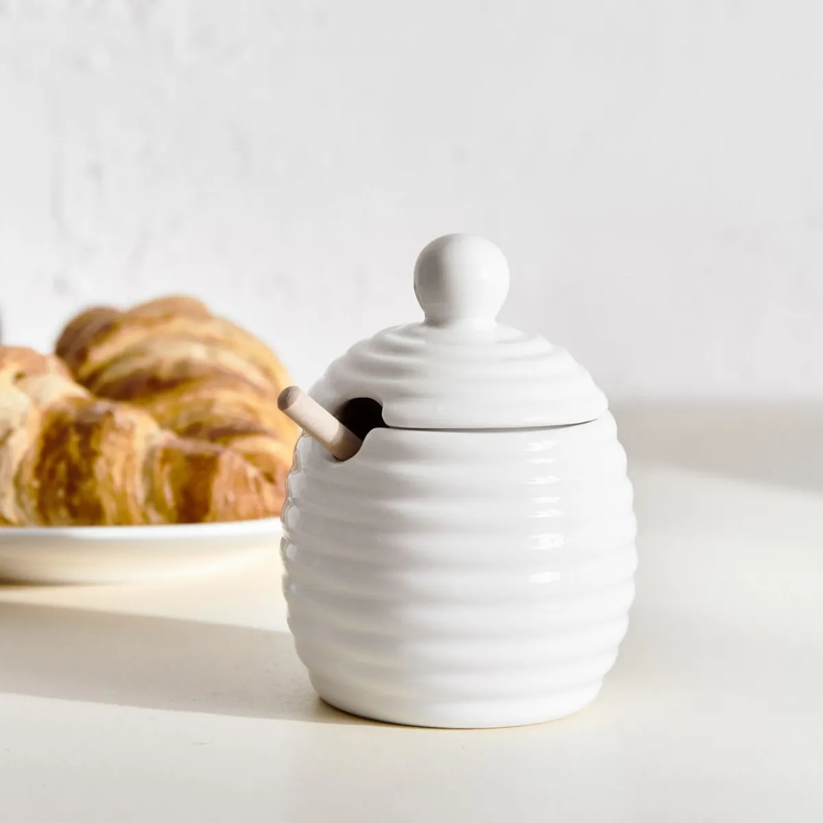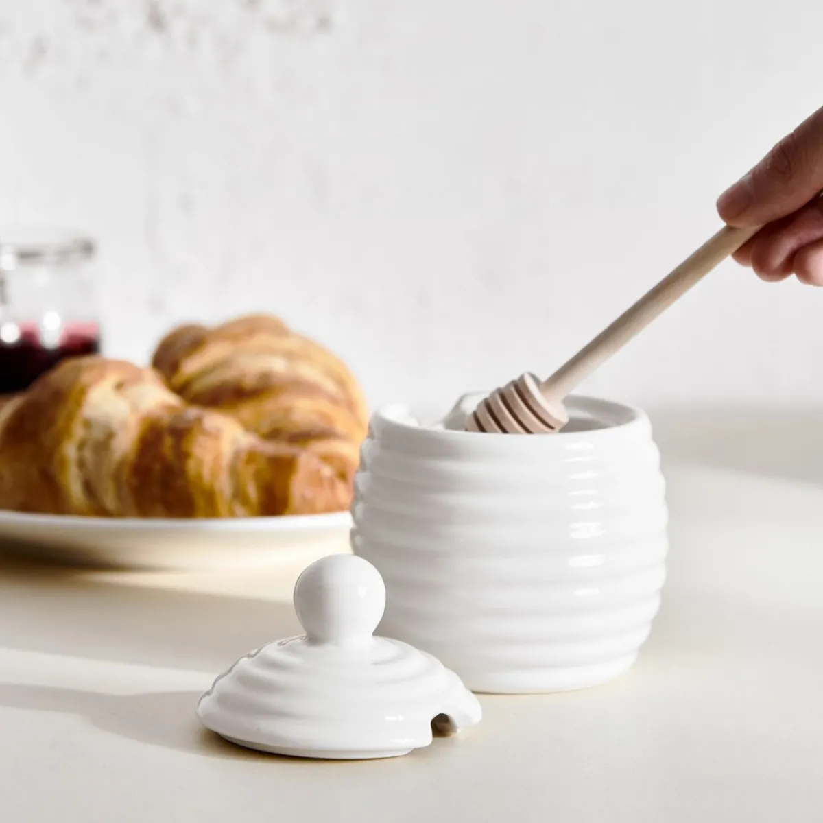 Opis ProduktuPrzeznaczenie Słoik Na Miód Fincan Umożliwia Ci Przechowywanie Produktów Spożywczych W Estetyczny Sposób. Intrygująca Bryła Oraz Minimalistyczna Estetyka Sprawiają, Że Pasować Będzie Zarówno Do Minimalistycznych, Jak I Bardziej Odważnych Aranżacji. Do Słoika Dołączony Jest Specjalny Czerpak Do Miodu. Cechy Charakterystyczne Słoik Na Miód O Pojemności 0,3 L Charakteryzuje Się Ciekawą Bryłą. Pękaty Kształt Ozdobiony Został Poziomymi Żłobieniami, Przez Co Wyglądem Imituje Naturalny Ul. Wyposażony Został W Wygodną Gałkę Od Pokrywki, A Także W Czerpak Wykonany Z Drewna Bambusa, Który Ułatwi Ci Nakładanie Miodu. Materiał Sam Słoik Wykonany Został Z Ceramiki, Dzięki Czemu Łatwo Będzie Wyczyścić Go Po Skończonym Użytkowaniu. Czerpak Do Miodu Został Wykonany Z Drewna Bambusowego, Które Cechuje Się Dużą Odpornością Na Wilgoć I Działanie Wody – Ten Element Możesz Myć Ręcznie. Porcelanowy Słoik Można Myć W Zmywarce.