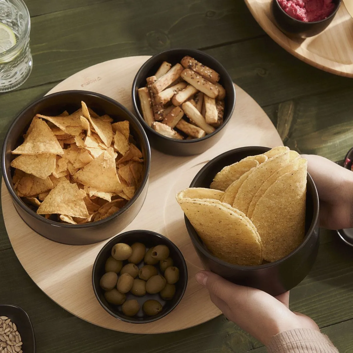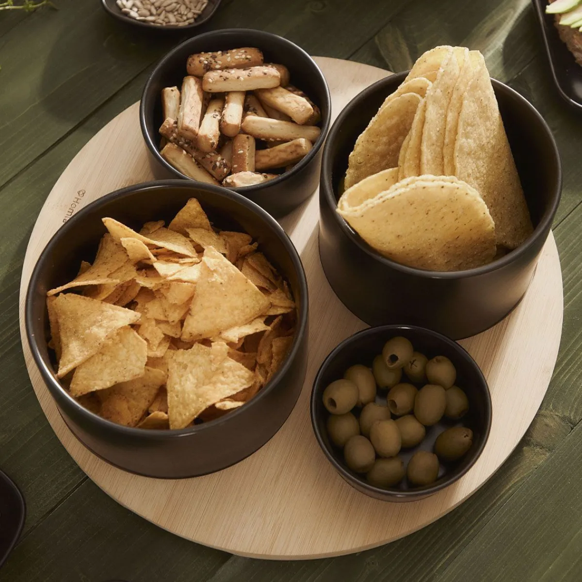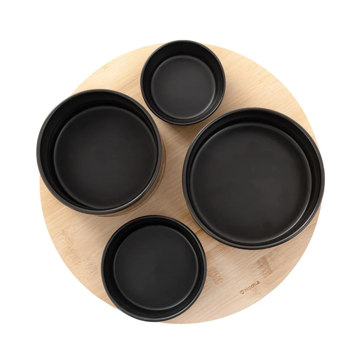 Zestaw Czarnych Miseczek Na Bambusowej Desce